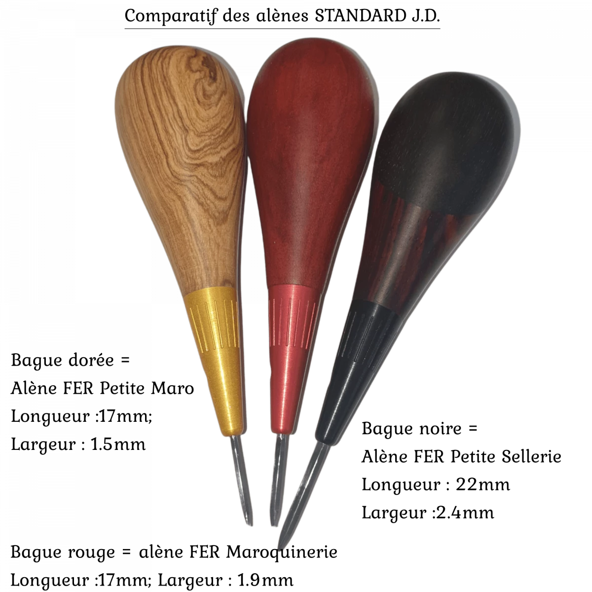 Le bouton de culot et la virole sont en Aluminium Anodisé, doré pour les alènes petite maroquinerie, rouge pour les maroquinerie et enfin noir, pour les Petite Sellerie (photo 5 pour voir le comparatif entre ces trois tailles) .